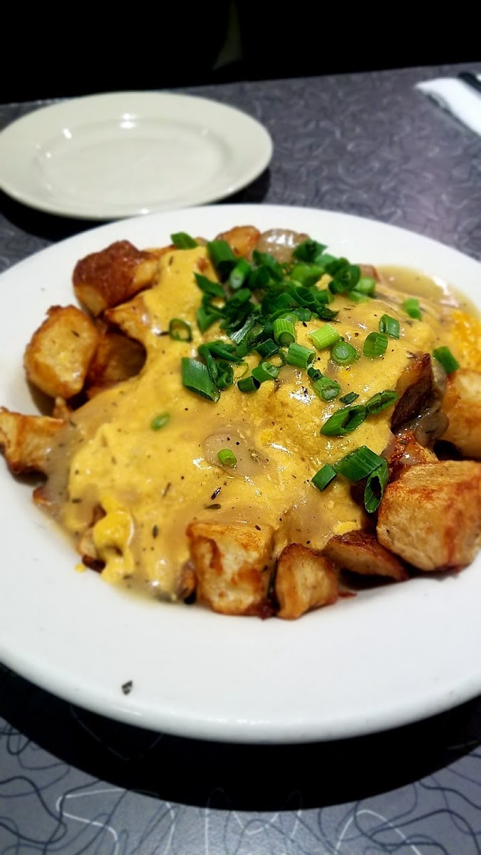 I've been here two times so far, and both times I've been impressed! The decor is really cute and gives off the vibes of an old-school diner. Veggie Galaxy is terrific if you're dining with people who may have dietary restrictions or simply if you just want vegetarian or vegan food. This place gets really busy on weekends for breakfast and brunch, so be prepared for a wait. We got there on a Saturday around 12:30 PM and the wait for a table of 2 was nearly an hour. With that being said, the wait is definitely worth it. By the time we were seated, I was STARVING. I over-ordered food because everything sounded so good and the prices were pretty affordable (especially for the area). The portions are large which was a pleasant surprise. In terms of appetizers, our waitress recommended the Vegan Mac & Cheese Bites and Potato Salad. I loved the Sriracha Aioli that came with the Mac & Cheese Bites; I even added it to the super garlicky potato salad! I've also gotten their Brussels sprouts which were drenched with a delicious Sriracha agave glaze and ranch dressing drizzle. In terms of entrees, I've gotten the French Toast and their waffle. I definitely recommend their super fluffy and soft French Toast. It comes with a sweet banana butter and maple syrup. I would definitely recommend adding on their coconut whipped cream for $1.50 as well. Their waffle wasn't anything too special, it sort of just tasted like a regular waffle you could get anywhere. The menu also says waffles, so I thought I was getting multiple waffles, but it ended up being one large waffle, which was interesting. Overall, this place is amazing! Regardless if you're vegetarian or vegan, you have to stop by here to try out their delicious eats. They also have sweet treats that look really tasty -- that'll be the next thing that I try!